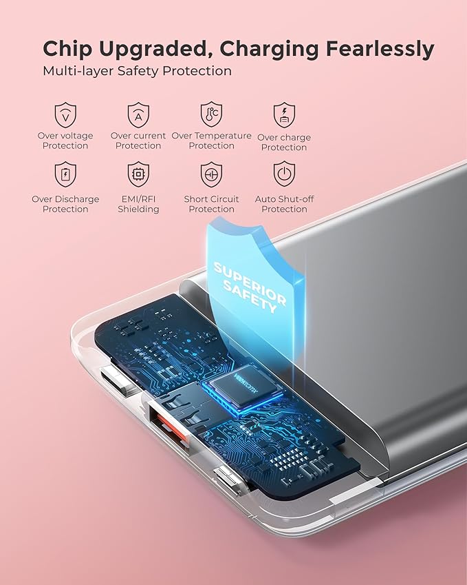 - [ From VEEKTOMX Multi-Layered Safety ] Certified by CE, RoHS, FCC, the VEEKTOMX mini power bank features a constantly upgraded intelligent chip that ensures smarter, safer charging. With temperature-sensing technology that automatically stops charging in extreme heat, and multi-layered protection against overcurrent, overcharging, overheating, and short circuits, VEEKTOMX is designed to give you added confidence and protection while charging.
