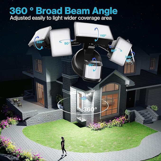 - Light Up Wide Coverage: This 10,000 lm motion lights for outside lights up yards, garages, driveways, and more. Its five-headed adjustable design provides 360-degree coverage, illuminating up to 1977 square feet to enhance home security at night