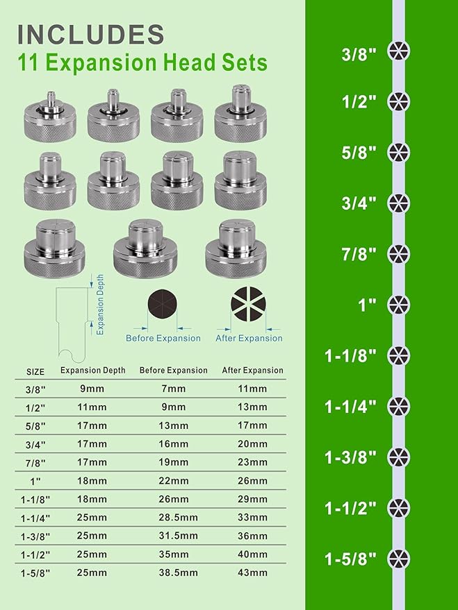 - APPLICATIONS -- Comes with 11 expender heads of 3/8'', 1/2'', 5/8'', 3/4'', 7/8'', 1'' , 1-1/8'' , 1-1/4'' , 1-3/8'' , 1-1/4'' and 1-5/8''(O.D.), Compatible with a wide range of pipe diameters, easy to swage aluminum tube, brass tube, copper tube, Titanium tube, soft steel and other soft tube.