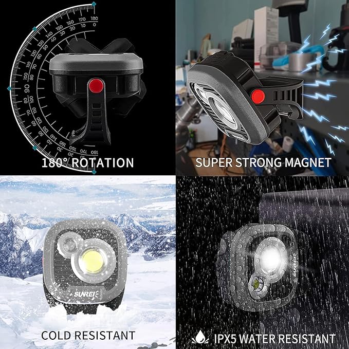 - [180°Rotation/Noctilucent Strip Design]: work light for mechanics can be rotated 180° and stand, allowing light to be positioned at any Angle. The rechargeable magnetic flashlight outer ring is designed to be glow-in-the-dark, making it easy to find it quickly in dark environments.