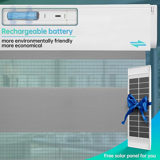 - ENVIRONMENTAL AND COST SAVING: Our motorized zebra blinds are not only convenient,but motorized blinds are also environmentally friendly. Solar powered motorized zebra blinds are charged automatically during the day, eliminating the need for batteries or frequent charging, saving money and reducing their carbon footprint. Join us and contribute to the eco-friendly home without sacrificing fashion. Our motorized blinds have a stylish and modern design that adds a touch of elegance to any room .