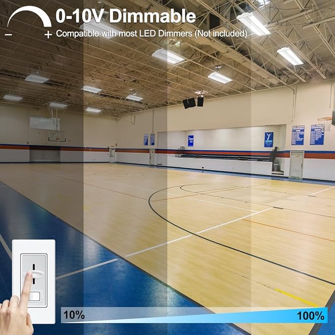 - [0-10V Dimmable and Anti-glare] This high bay LED light is 0-10V dimmable, allows you to control LED output intensity to achieve optimum lighting effect (Dimmer switch not included). Using frosted polycarbonate lens, it’s also anti-glare and non-dazzling. Perfect for lighting up large areas, including warehouses, workshops, factories, stadiums, gyms and exhibition halls.