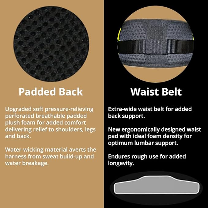 - COMFORT: Upgraded soft pressure‑relieving perforated breathable padded plush foam for added comfort delivering relief to shoulders, legs, and back. New specially formulated webbing flexes to accommodate movement and body contours for optimum comfort around legs & shoulders. Water‑wicking material averts the safety harness from sweat build-up and water breakage—essential for long days using a fall protection harness.