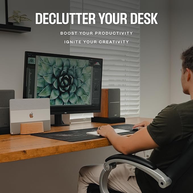 - AESTHETIC ELEGANCE - Elevate your workspace and save desk space with our exquisite laptop vertical stand. Crafted from solid wood and premium weighted metal base, it adds style to your home office.