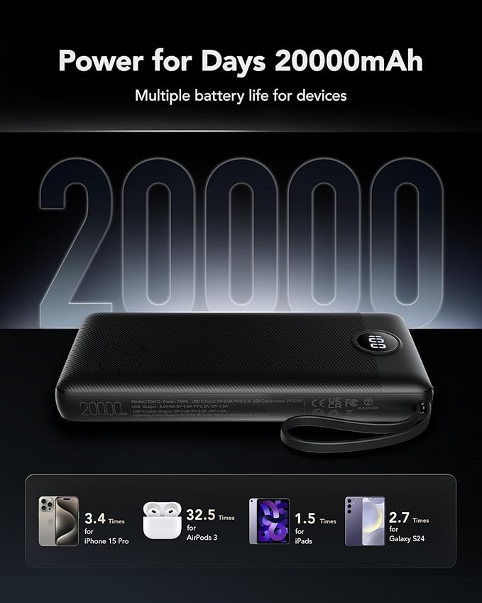 - 【Portable Charger with Built-in Cables】This 20000 mAh power bank battery has a built-in Micro cable, Type C cable, and another cable for iPhone, total of three durable output cables. It's convenient to charge for all smart devices directly. Also, the USB C portable charger has a built-in USB cable for recharge the power bank itself directly. Wherever you go, don't need to carry any extra cords.