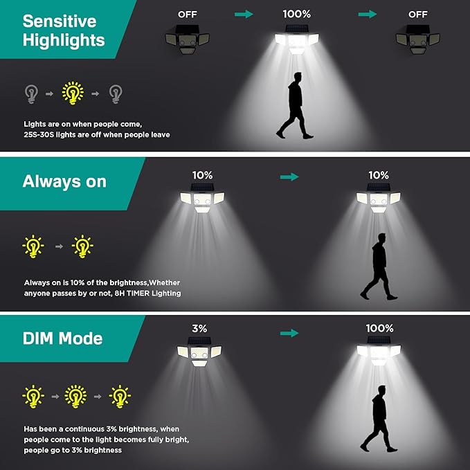 - 【Upgraded More Sensitive and Powerful Dual PIR Motion Detector】Our solar outdoor lights features 2 powerful PIR motion sensors, enhancing motion detection, capable of detecting motion up to 40 feet away within a 180-degree range.The solar outdoor light covers a broader area, providing longer illumination time for your peace of mind and security.