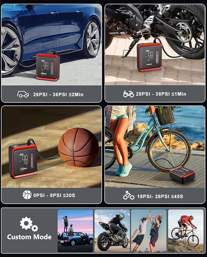 - ๐ ๐๐ฆ๐๐ซ๐ญ ๐๐จ๐๐๐ฌ: 5 preset modes for cars, motorcycles, bikes, and sports balls, the portable air pump is easy to operate. You can also customize the pressure value (2-150 PSI) for different inflation objects. Whether you're at home, on the road, or on a trip, this compact and user-friendly tire inflator is a powerful solution for your pumping needs.