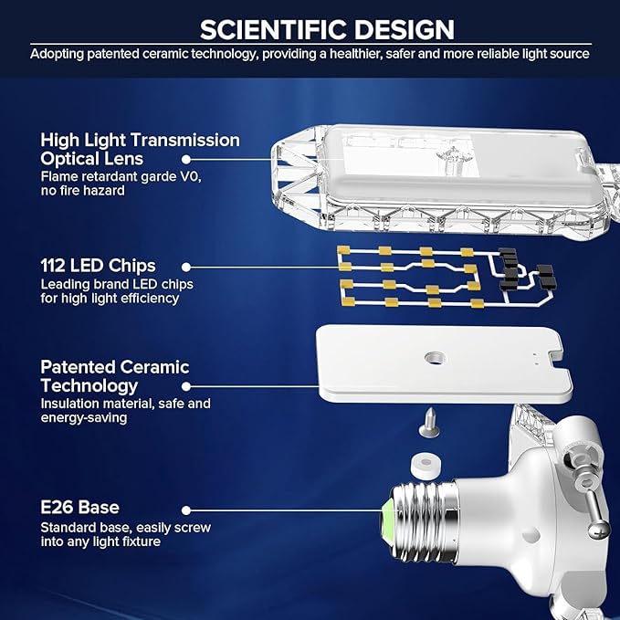 - SCIENTIFIC & ADJUSTABLE DESIGN: With 6+1 adjustable panels design for 360° wide-angle LED garage lighting. Each panels can be folded from 0 to 90 degrees according to your different application, which will make the light cover up to 360° area, no dark areas, ghosting or glare. SANSI's Scientific design provide you with a more healthy, safe, reliable and convenient light source