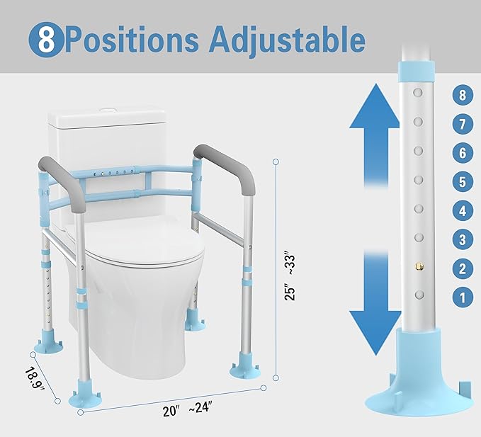- [Adjustable Design, Fit Any Toilet] - Designed to fit any style of toilet, Delog foldable toilet support rails FSA / HSA eligible can be adjustable width from 20" to 25", easy fold to carry around. Toilet safety frame adjusts in 8 height from 24" to 31", suitable for all the height.