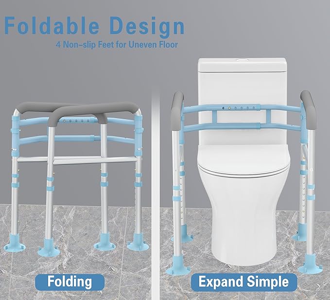 - [Folding Storage, Save Your Bathroom] - Delog stand alone safety assistance provides a stable support for users to sit or rise from a commode. Essential for tiny bathroom, super-easy fold to storage and break down quickly to pack in a suitcase for traveling.