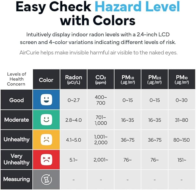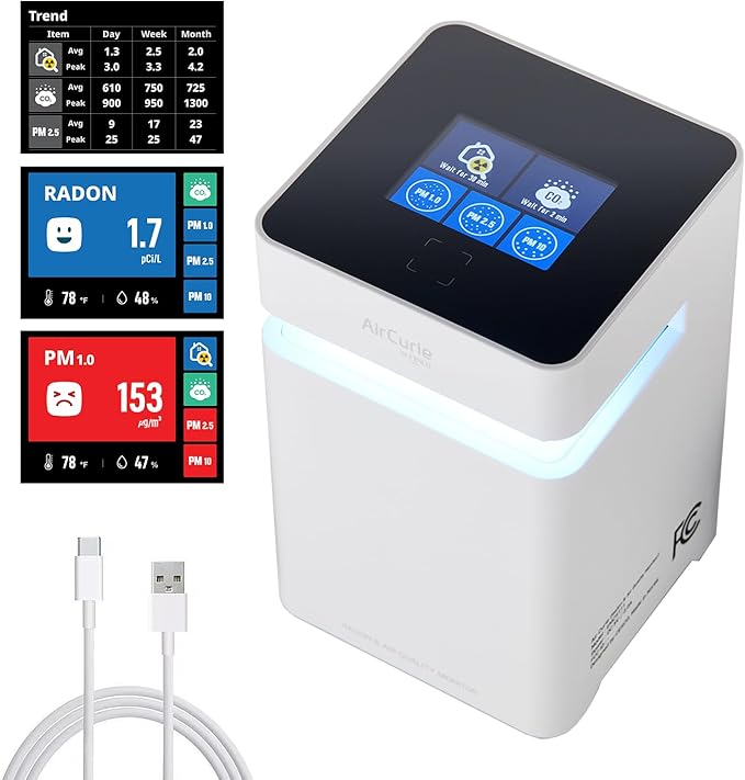 AirCurie Ver2, Radon Detector for Home, 5-in-1 Total Indoor Air Quality Monitor [PM1.0, 2.5, 10, CO2, Humidity, Temp] Easy to Use