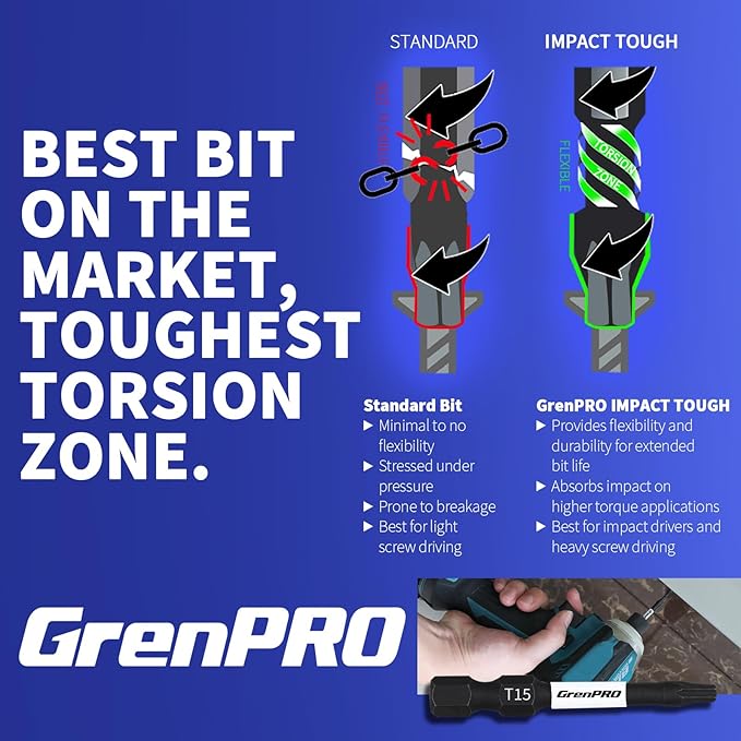 - Torsion zone to absorb torque peaks to avoid breakage. 10 times life expectancy versus standard bits. For impact driver, drill and screwdriver