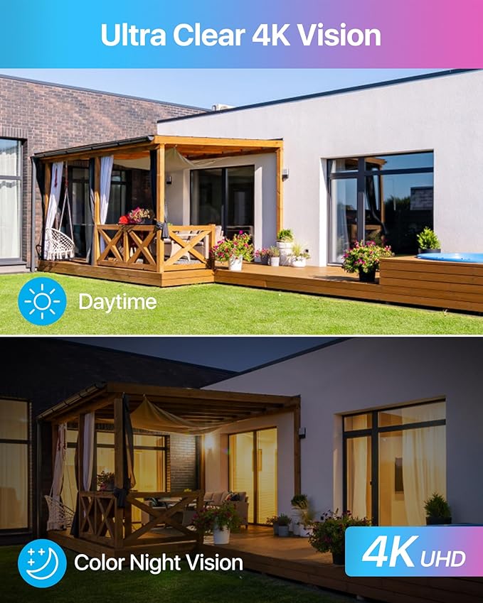 - [4K UHD and Color Night Vision] With our 4K CMOS image sensor, which enhances color, contrast, and low-light performance, you can capture very detailed images. High resolution and the ability to digitally zoom in without sacrificing quality provide greater visibility and clarity. Improve your monitoring with cutting-edge technology. Up to 100ft night vision, so you can see clearly even at night.