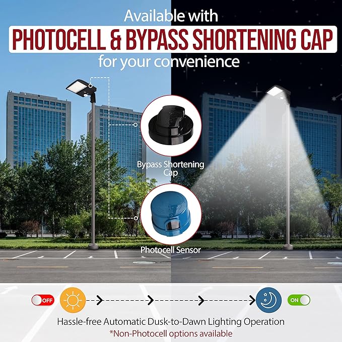 - PHOTOCELL INCLUDED: The light features a built-in photocell that enables automatic operation from dusk to dawn. This convenience helps in reducing energy consumption while ensuring that areas are well-lit during nighttime hours, enhancing security and functionality.