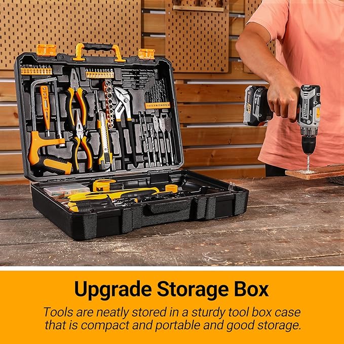 - 【ALL TOOLS IN ONE TOOLBOX】This household tools kit contains the most useful and necessary tools in one box storage as the origanizer of tools sets: 20V battery power drill set and combo kit, screwdrivers, saw, hex key, bits, sockets, drive spinner handle, tape measure, claw hammer,hammer cap,adjustable wrench, level, pliers set and plastic toolkit case etc.