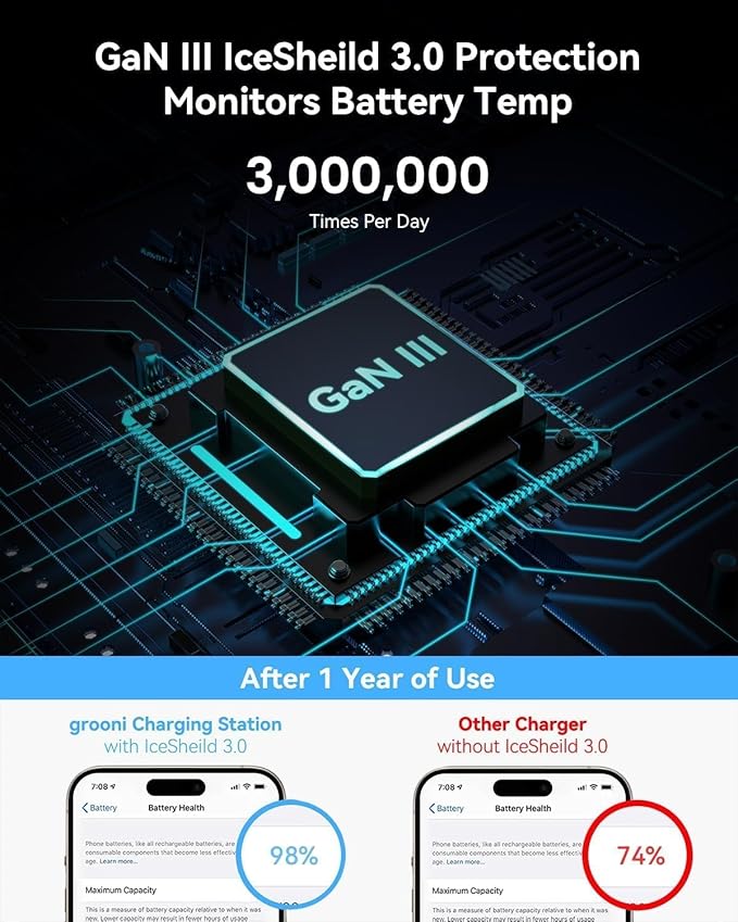 - ✅【Multi-Protection System & Advanced GaN III Technology】Featuring IceShield 3.0 Gallium Nitride (GaN) technology, the USB C charger station boasts an enhanced surge protector and built-in safeguards against overcharge, overheating, short circuit, overcurrent, and overvoltage. It continuously monitors temperature, performing over 3 million checks daily to protect against fire risks and battery damage.