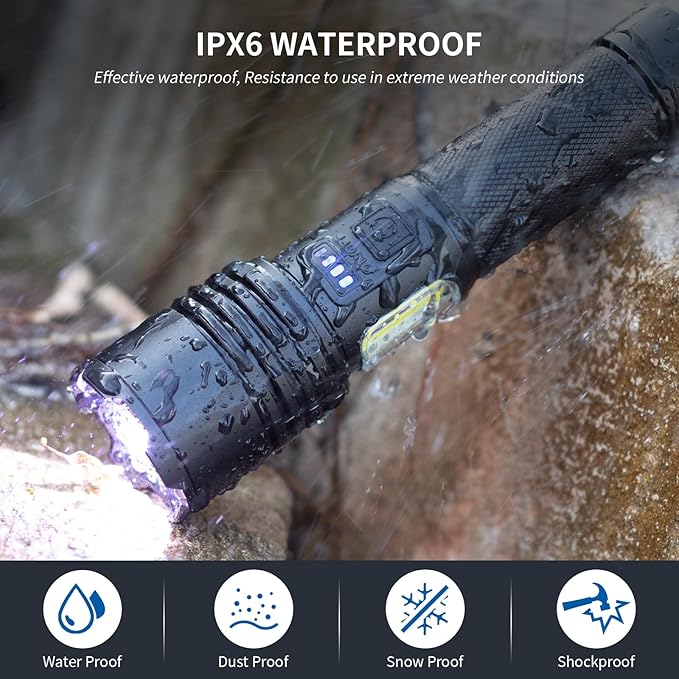 - 【IPX6 Waterproof】This waterproof flashlight with a tight waterproof design, have IPX6 waterproof and anti-slip function, can be used in extreme weather such as rain. However, please do not submerge this hiking flashlight directly into water or discard the dust cover of the charging port as these may directly damage the camping flashlight.