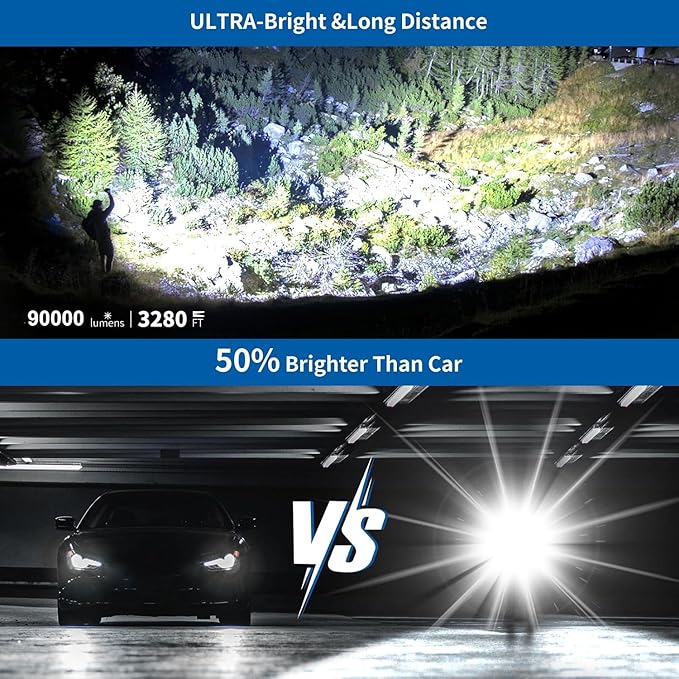 - 【90000 Lumens Flashlight】KINGCAESAR high lumens flashlight max output up to 90000 lumens, several times brighter than ordinary flashlights. Projects a wide beam of light that clearly illuminates things within 200 square meters, easily lighting up an entire room or backyard. with a maximum illumination distance of up to 3,280 feet., It can be easily used in various situations such as camping, hu∩ting or emerge∩cies.