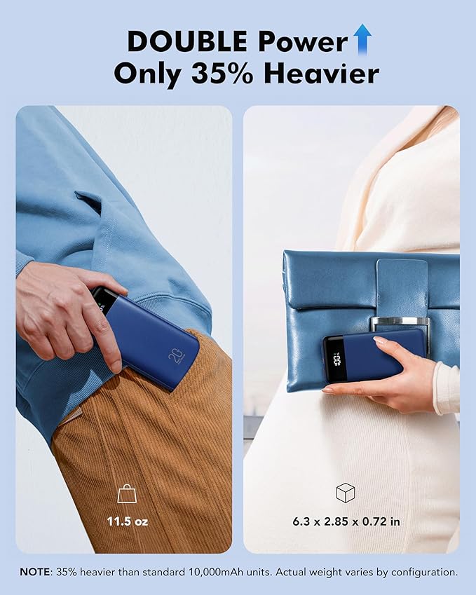 - 🔋【Double the Power, Only 35% Heavier】Battery pack 20,000mAh (2X capacity of standard chargers) in just 6.3 x 2.85 x 0.72 in - only 35% heavier than 10K models but holds twice the energy. Fits anywhere a paperback book would.