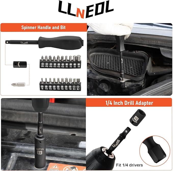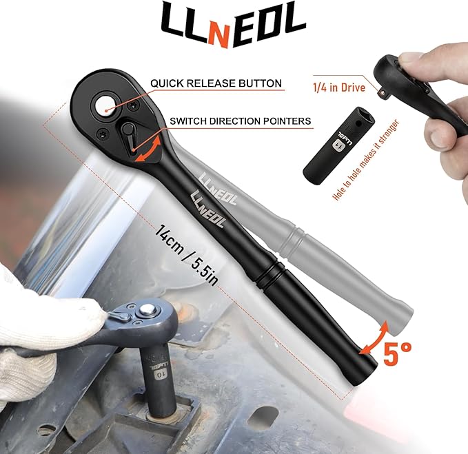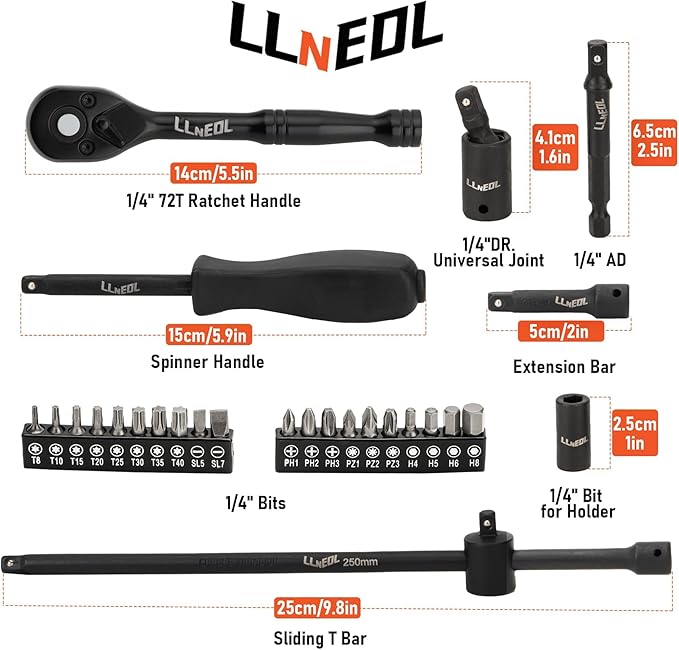 - ๐ใMASTER WRENCH SETใ LLNEDL 1/4 inch socket set include: 28x METRIC (Deep/Shallow): 4, 4.5, 5, 5.5, 6, 7, 8, 9, 10, 11, 12, 13, 14, 15mm; 22x SAE (Deep/Shallow): 5/32, 3/16, 7/32, 1/4, 9/32, 5/16, 11/32, 3/8, 7/16, 1/2, 9/16"; 5x E Torx: 4, 5, 6, 7, 8mm; 1x 1/4" 72-Tooth Ratchet; 1x U-Joint; 2x 1/4โ Extension Bars: 2, 10"; 1x T-Bar Adaptor; 1x Spinner Handle; 1x Coupler for Bit; 1x 1/4" Power Tools Adapter; 20x Bits.