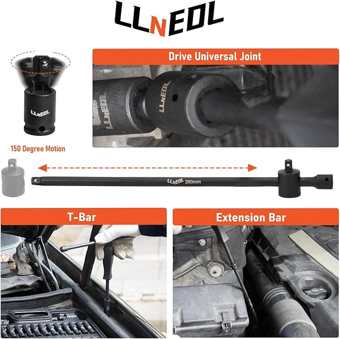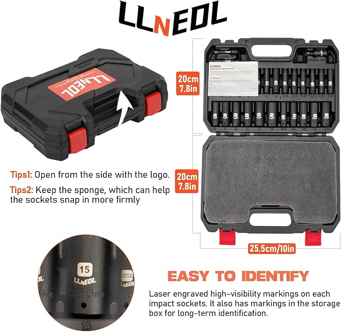- ๐ใEASY TO IDENTIFYใ There are laser-engraved high-visibility markings on each LLNEDL impact socket. It also has markings in the storage box for long-term identification.