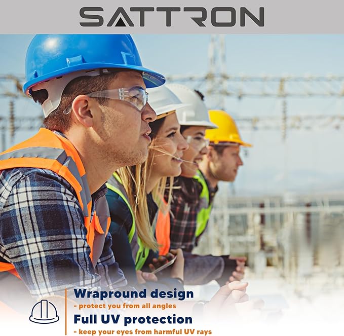 - 【INDUSTRIAL GRADE PROTECTION】SATTRON eye protection meets ANSI Z87.1 Standards. Each pair of glasses is impact, ballistic and scratch resistant tested, protect you from flying debris and particles. High quality polycarbonate lenses can help you block 99.9% of harmful UVA/UVB rays.