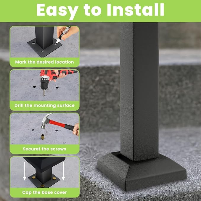 - 【Easy to Install】This handrails for outdoor steps is very easy to install, just choose the position you want, mark it, drill holes in the mounting surface, install the screws, and finally put the base cover on the fasteners; Install takes just a few minutes.