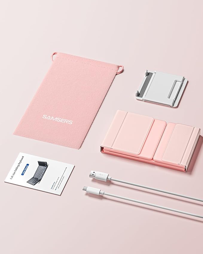 - 【Little Things & Big Convenience】 Samsers portable folding keyboard, only 9.3 ounces. Palm-sized keyboard can be folded up magnetically and put in your briefcase without taking up much space. Maximum convenience for you with minimum weight and size! Comes with a Phone stand and a velvet storage bag, the perfect companion for a folding keyboard. Not just a keyboard, but a travel solution!