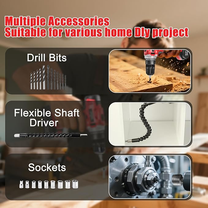 - New Upgraded Feature Design: 1. Built-In LED Work Light for safety、reliability、visibility and accuracy, Illuminates dark work areas. 2. Magnetic Bit Holder, drill can be adsorbed screws, Prevents bits from falling and allows for one-handed operation, speed up your work efficiency. 3. Flexible shaft helps you to drill the places that are difficult to reach. 4. The 3/8" keyless chuck for quick and easy bit changes without tools. 5, A forward/reverse switch determines the direction of the power drill and also serves as a lock-off button. Maintenance and Cleaning Before any work on the machine as well as during storage, set the rotational direction switch to the center position