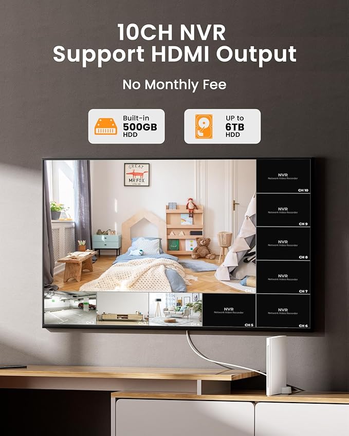 - No Monthly Fee with 10CH NVR: The solar security camera system supports up to 10 channel, to meet your needs to monitor more areas. Our cctv camera security system comes with a 500GB HDD pre-installed, expandable to 6TB ( supports 2.5-inch hard disk only),without any monthly or hidden fees. Please format the hard disk before first use