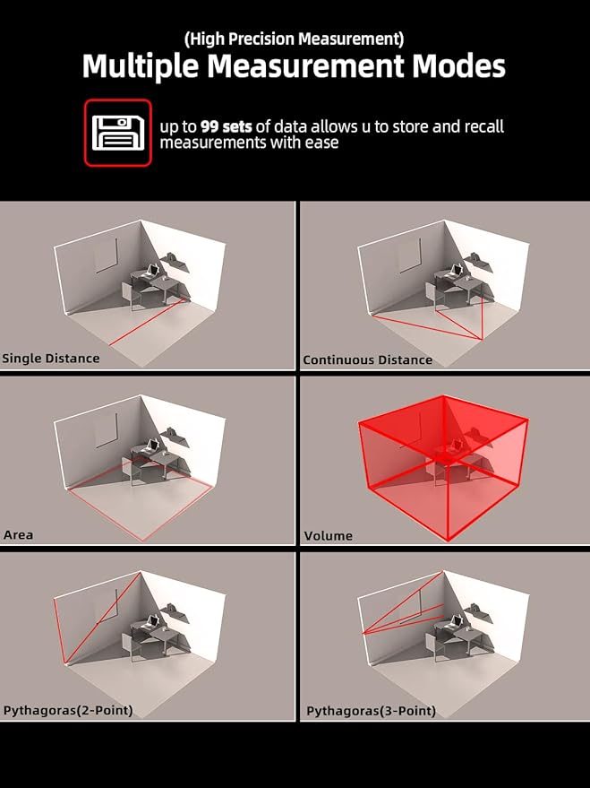- Multifunctional Measurement - area, distance, length, volume, continuous measurement, and Pythagorean calculations; Low battery indication; 99 groups data memory; Manually delete data; Auto shut down after 150s without any operation to save power