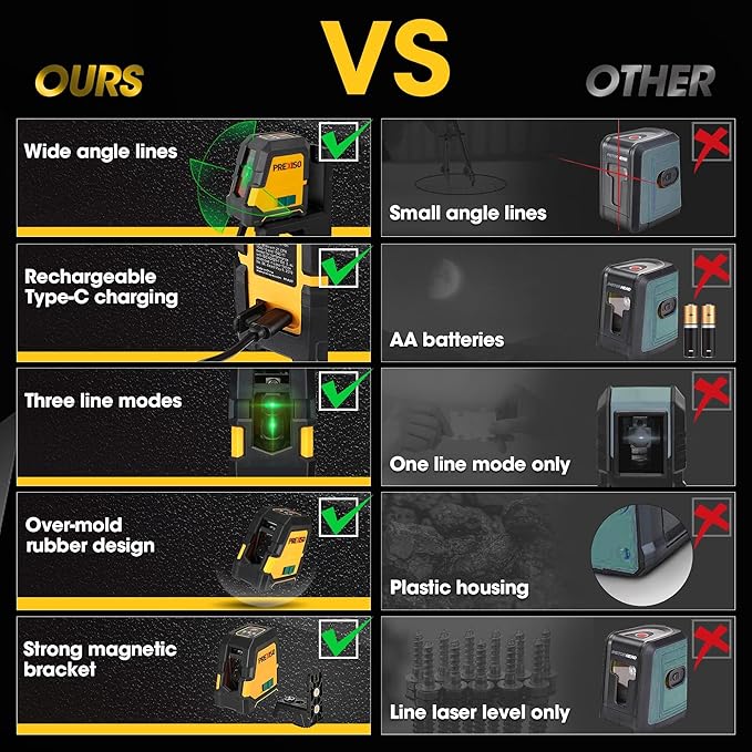 - Type-C Charging & Universal Usage: Built-in 2600 mAh Rechargeable Lithium-ion Battery; Rotatable 360° magnetic mounting base to assemble with the 1/4"-20 treaded mount at the bottom of the tool. Suitable for wide uses, such as paving tiles, installing carpentry for doors, windows, or furniture, hanging wallpaper, etc. PREXISO line laser dustproof, wear-resistant, cold, and high temperature. Covered by TPE soft rubber for shock-resistant and comfortable grip
