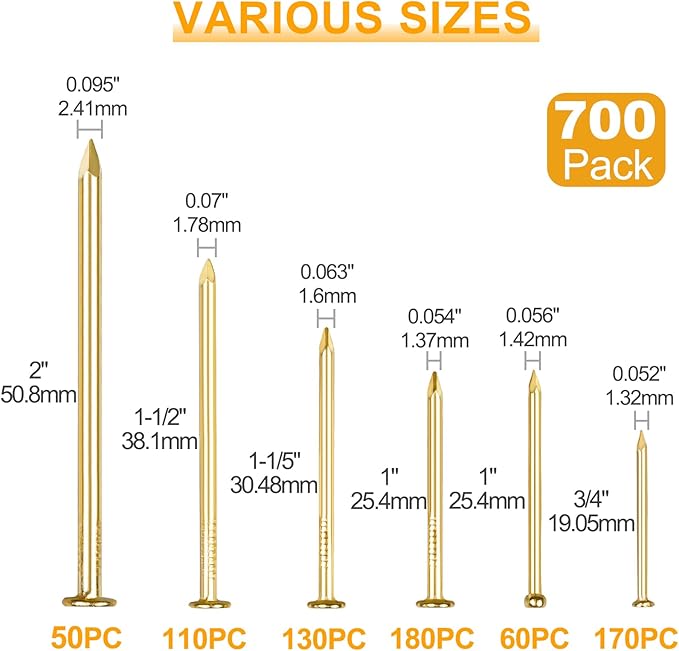 KURUI Gold Picture Hanging Nails Assortment Kit, 700 Pcs Wall Hanging Set for Frame Art Photo, 6 Sizes Brass Small Framing Nails Assorted Kit