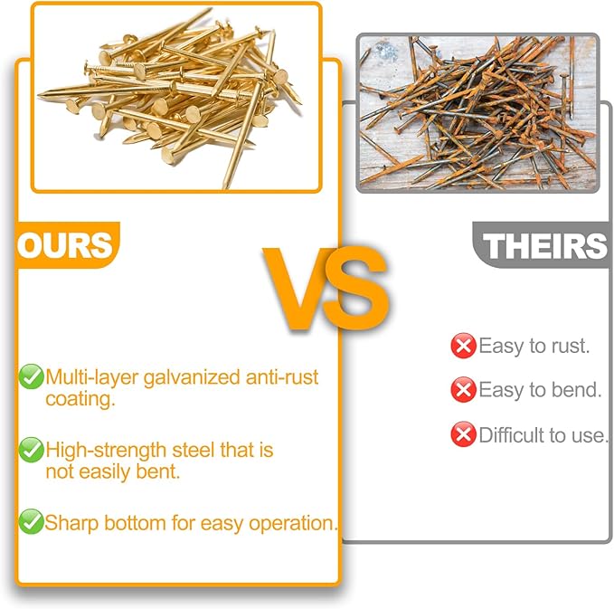 - PREMIUM QUALITY MATERIAL – KURUI gold nails are constructed of galvanized high carbon steel with exceptional toughness to prevent deformation during usage, and the surface is covered by multiple layers of galvanization to prevent corrosion or rust for an longer service life.