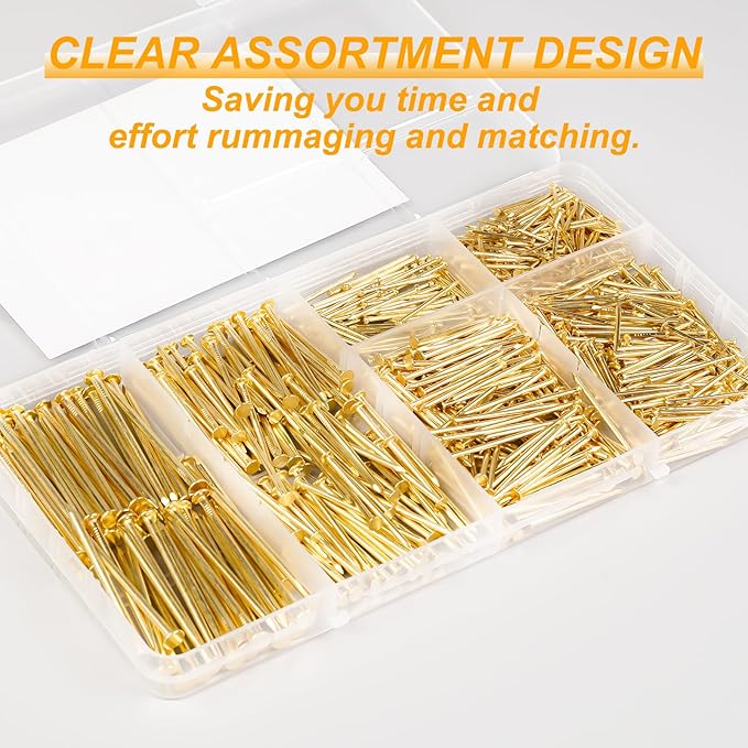 - EXCELLENT DESIGN - The gold nails assortment kit comes with a transparent box in which different sizes of picture nails are neatly organized in each small compartment, allowing you to immediately locate the size you need at a glance while working and saving you a great deal of time rummaging.