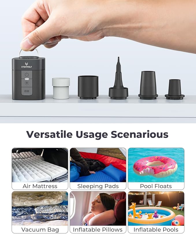 - FIVE NOZZLES & DIVERSE USES: Comes with five nozzles, AIR 3 is suitable for most inflatable products, such as air mattresses, pool floats, vacuum storage bags, inflatable beds, sleeping pads, swimming rings, inflatable furniture and other inflatable toys
