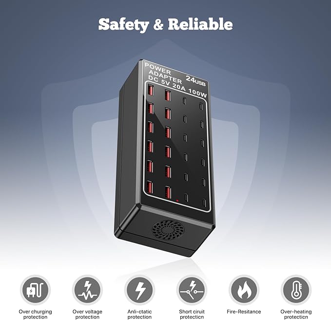 - ๐What You Get: 1x100W 24-port USB C charger station for multiple devices, 5ft / 1.5m ultra long detachable power cord.