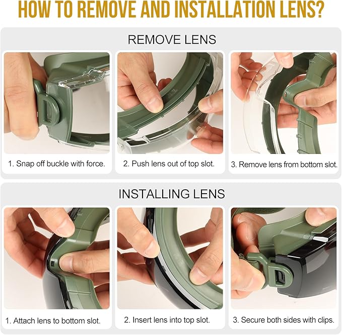 - 【Interchangeable Lens】Our goggles are equipped with interchangeable lenses for customizable vision in any weather or lighting condition. The gray lens offers superior UV and glare protection for sunny and bright conditions, while the clear lens provides high-definition and clear vision for cloudy, low-light, or nighttime use. Stay prepared for any environment with our versatile design. Optimize your vision now!