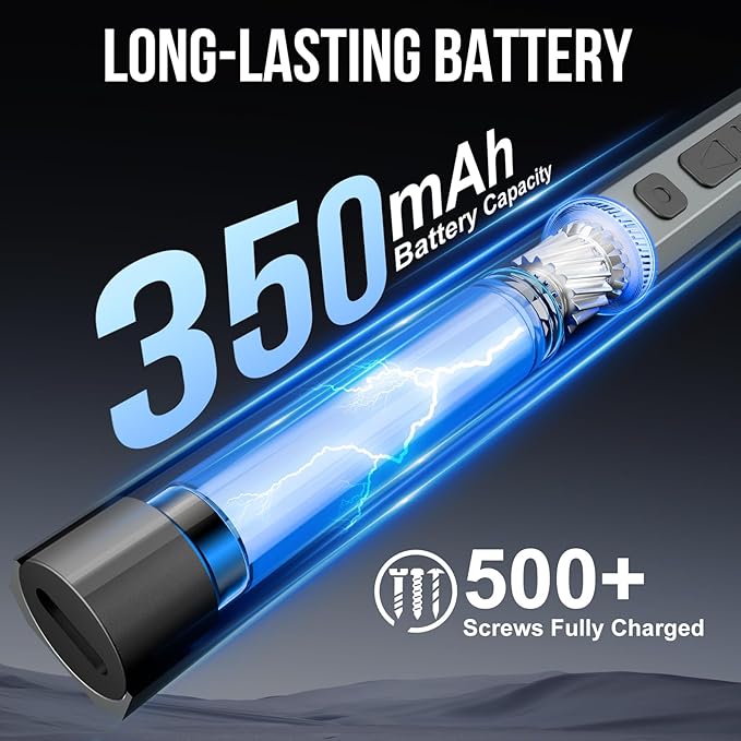 - 【Rechargeable and Long-Lasting】This cordless mini electric screwdriver powered by 350mAh lithium-ion battery which has undergone 28 battery-related tests to ensure safety and a longer working time. With a fast charging time of 60 minutes, this electric screwdriver rechargeable provides continuous power for your projects. And universal Type-C charging interface makes charging convenient for the precision electric screwdriver