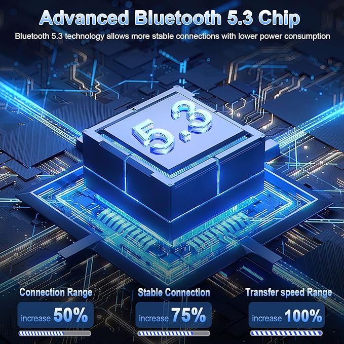 - Fast and stable Bluetooth 5.3 connection: Bluetooth earphones that adopt Bluetooth 5.3 chips have an extremely low input latency, which means their audio stays synced with your device and will never stutter. This also makes the wireless earphones have a superior sound quality and strong signal, so that there is no disconnection in listening to music and offer stable and enough distance 10m connection for you.