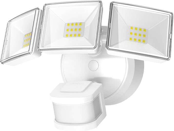 - 【2 Infrared Detectors for 240° Sensing】Equipped with two sensitive infrared detectors, the motion light has a wider 240° sensing range, which is one more than on the market. The sensor will auto recognize sunlight and will not be affected by other lights. Features 3 heads light panels with a lighting angle of 340°, the security light can light up 3500sq.ft areas like yard, patio, garage, front door, eave.