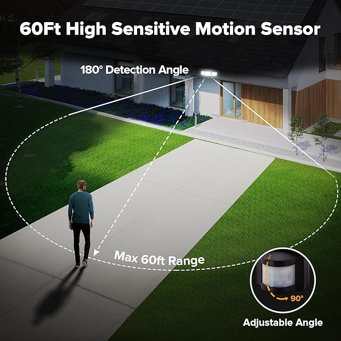 - 【3 Lighting Modes & Wide Applications】 The solar security light offers three versatile lighting modes: ① Motion-activated 100% brightness at night; ② Always-on 10% brightness at night for 8 hours ; ③ Always-on 3% brightness at night with motion-activated 100% brightness. These modes satisfy various usage requirements, making it suitable for outdoor use in garage,yard, porch, and swimming pools, etc.