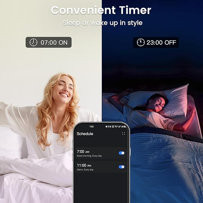 - 【Timer & Multiple Scenes】Set up a personalized schedule using timers or countdowns to automate the on/off functions of the Alexa light bulbs at your desired times, serving as gentle reminders for waking up or winding down for sleep. With 16 million colors and multiple preset scene modes, you can customize your own scenes, allowing you to create various occasions, like party, dating, relaxing and so on.