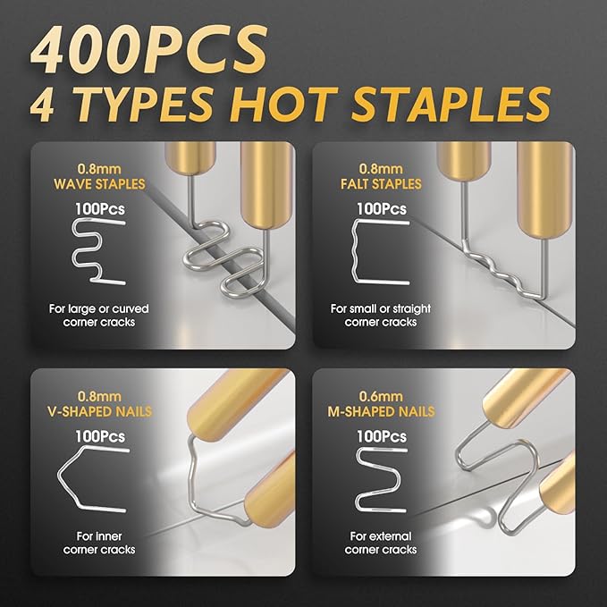 - [Plastic Repair Kit Lists] Equipped with: 1 * portable toolbox, 1 * USB charging cable, 1 * 120W cordless hot staple gun, 1 * knife, 1 * pliers, 400PCS plastic welding staples(including 100PCS flat staple, 100PCS V-shaped staple, 100PCS V-shaped staple and 100PCS wave staple).