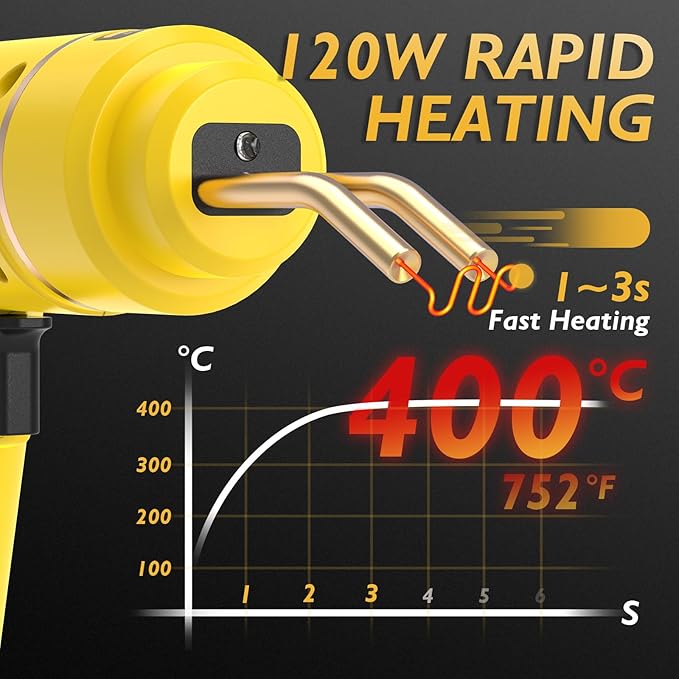 - [120W Rapid Heat] The power of the portable plastic welder is 120W, which can achieve rapid heating in 1-3 seconds. It is more efficient than other low-power plastic welder tools on the market, saving you time and achieving higher work efficiency.