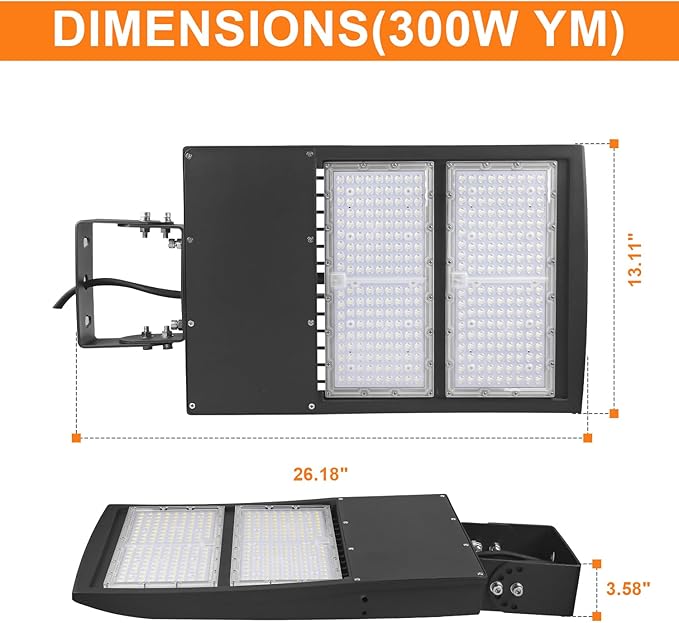 - 🏰【Wide Applications】--This one 480V 300W LED parking lot lights give the lamp a adjustable lighting range and can be applied to a variety of outdoor scences, such as parking lots light, driveway light, city expressway, trunk/rustic road, factories, playground, school, gas station, courtyard, public park, walkway, exterior, driveway, store, farmyard, residential area light or any other commercial and industrial area.