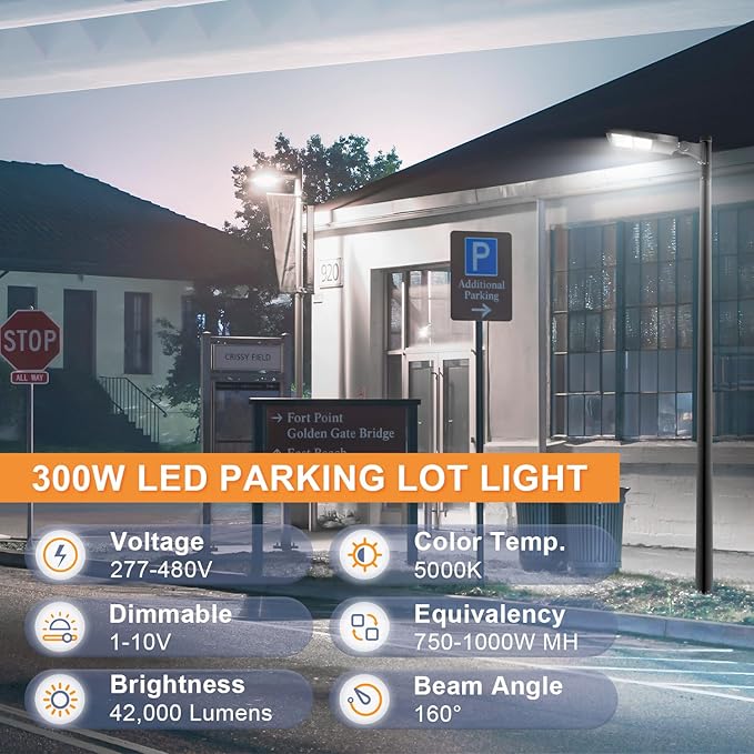 - 💡【Ultra Bright & Energy Saving】--This 480V 300W LED Parking Lot Lights Adopting advanced SMD 3030Chips,provides 42000 lumen output and bring 140lm/w high efficiency Ideal substitution for 1000W HPS/MH traditional lights. Cut down your electricity bill up to 80%, AC 277-480V 160°beam angle.CRI>80 5000K color temperature of lighting is a nice choice for street light illumination. Anti-shock, anti-moisture, no glare, no strobe light, no ghosting, protecting your eyes.