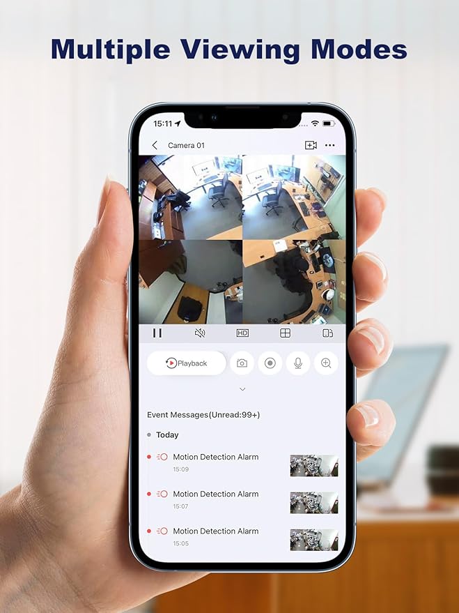 - Three Kinds of Viewing Modes: Our 5MP Fisheye 360° Security Camera offers multiple viewing modes to suit your surveillance needs. You can choose a 360° view to monitor a large area, or two 180° panoramic frames, with the option of 4 frames. Switch seamlessly between modes to focus on areas of interest, ensuring full coverage and detailed surveillance.