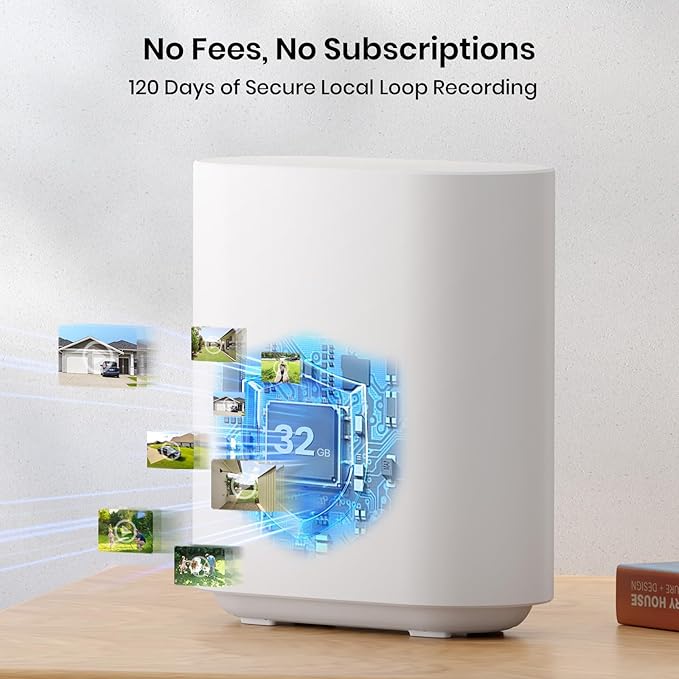 - No Monthly Fee with Homebase: All recordings will be encrypted and stored in home base without subscription or hidden cost. 32GB of local storage provides up to 4 months of video loop recording. Even if the cameras are damaged or lost, the data remains safe. Homebase also provides instant notifications and stable live streaming.