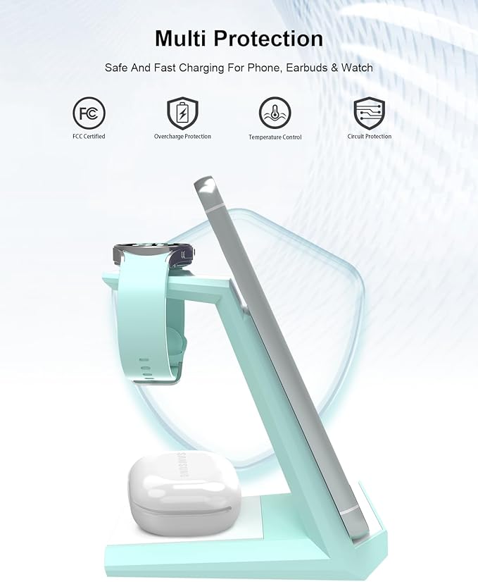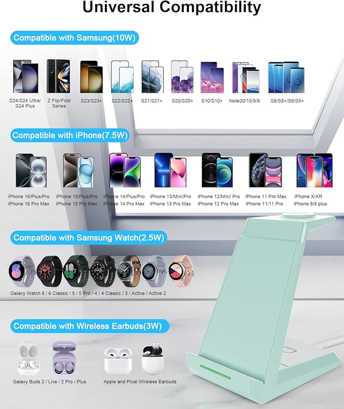 - [Compatible with Multiple Devices] The wireless phone charger dock has universal compatibility for more Qi devices. Phones: For Samsung Galaxy Z Flip/FoldS25/S25+/S25 Ultra//S24/S24 Ultra/S24+/S23 Ultra/S22+/S21/S20 fe/Note 20/10; For iPhone 15/14 Pro Max/13 Pro/12/11/XR/XS/X/8 Plus; Wireless Earbuds: Galaxy Buds/Buds Pro/Live ; AirPods 3/Pro/2 with wireless charging case; Watches: Only for Galaxy Watch 6/5/5 Pro/4/3 (Attention: Not for Apple Watch).